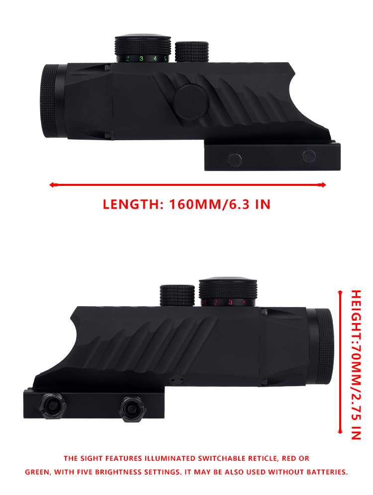 Features 3x 30 Prism Combat Sight with Red Green Illuminated Circle Dot Reticle. High-strength aluminum in black matt and beautiful complement. Optic lens coating help reduce glare, protect lens from scratches. The reticle is visible with or without illumination regardless of the environment. Fits on all 20mm Picatinny/Weaver/1913 rails.