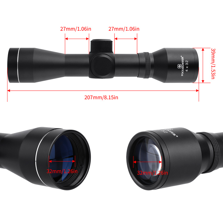 4X32 compact scope features 1/4 MOA fingertip Windage and Elevation adjustment & Fast-focus eyepiece.