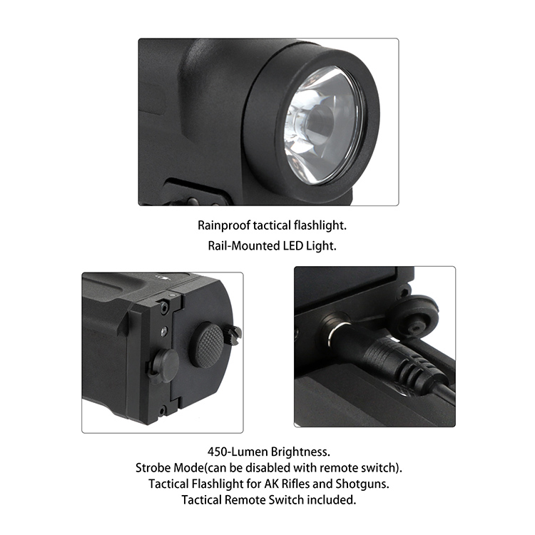 Features Tactical mode - constant light for detection/illumination of the target. and Strobe Mode - for the distinction of a target silhouette in fog or smoke environments. Bright and powerful, the light features an ultra-bright LED bulb that provides a maximum brightness of 450 lumens. Strengthened clear protective glass provides the most high-quality coverage of objects at distances up to 150 meters! The light is made from aircraft aluminum with a black anodized finish. Comes with a Tactical Remote Switch that allows you to turn the flashlight on & off with maximum convenience without changing the hand position. For user convenience, this AK SD Tactical Light utilizes Picatinny rail for installation and can be mounted directly to your barrel with B-9AK Rail Extender(included), and the included tactical remote switch can also be mounted to your rail. It's powered by two CR123A batteries.