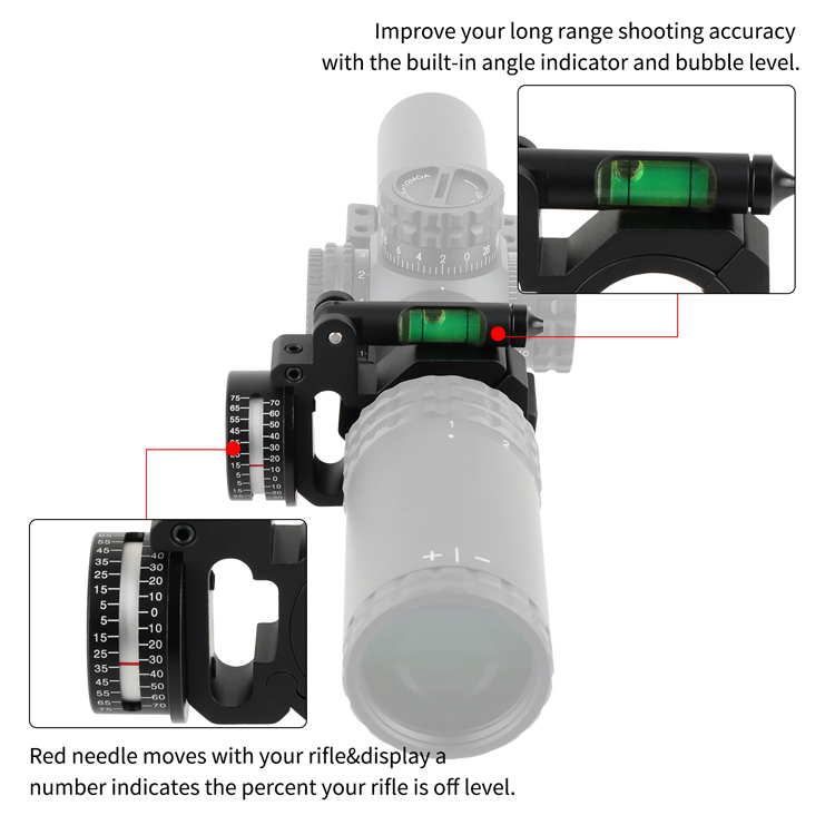 Improve your long range shooting accuracy with the built-in angle indicator and bubble level.