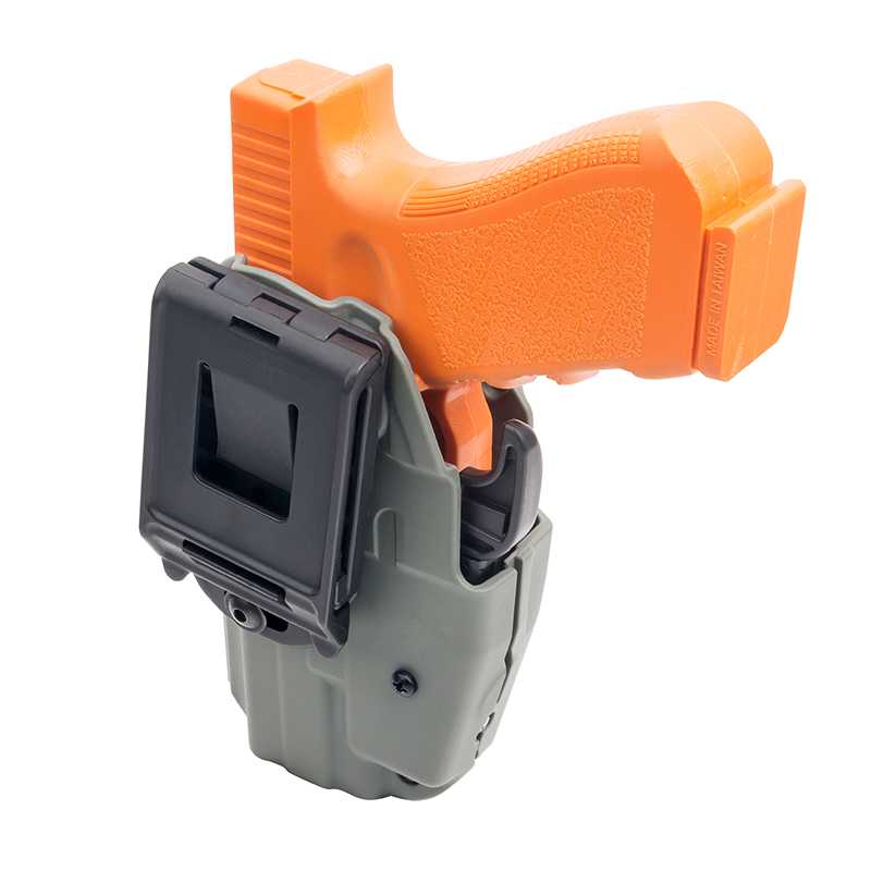 The lock release button is located at the back of the holster, which allows for comfortable and quick operation with the middle finger as well as minimizes the risk of accidental triggering.